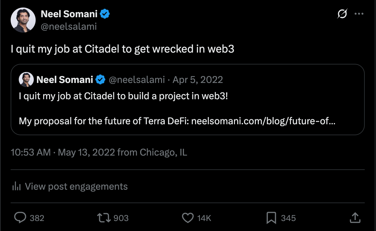 In some ways, my entrepreneurial career started on X. I was a quant at Citadel at the time, and a shitposter on the side. I left in 2022 at the calling of my wise friends, who advised me to build on the Terra blockchain.