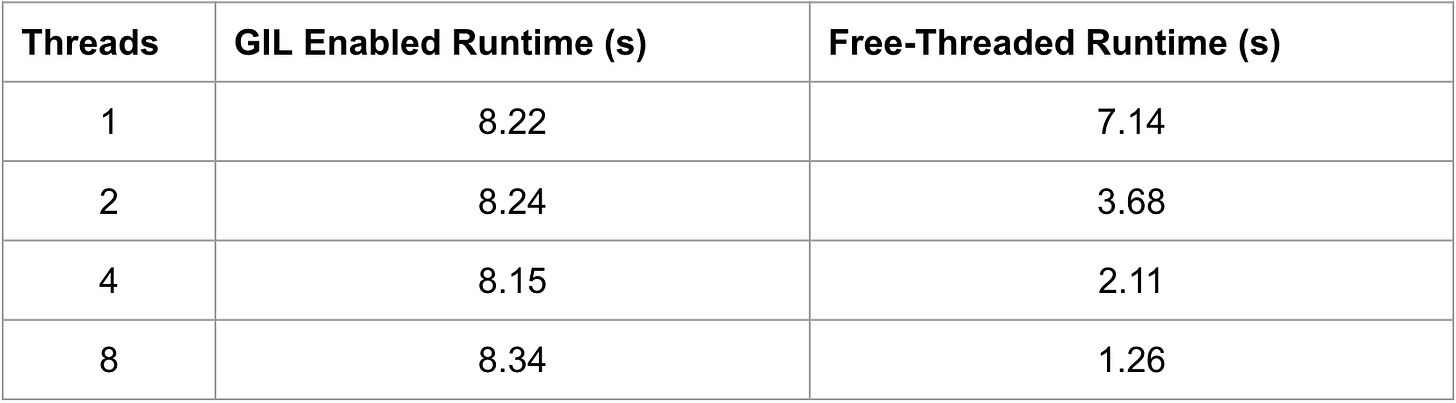 That’s an ~8x speed-up without changing a single line of logic - just running under the free-threaded interpreter.